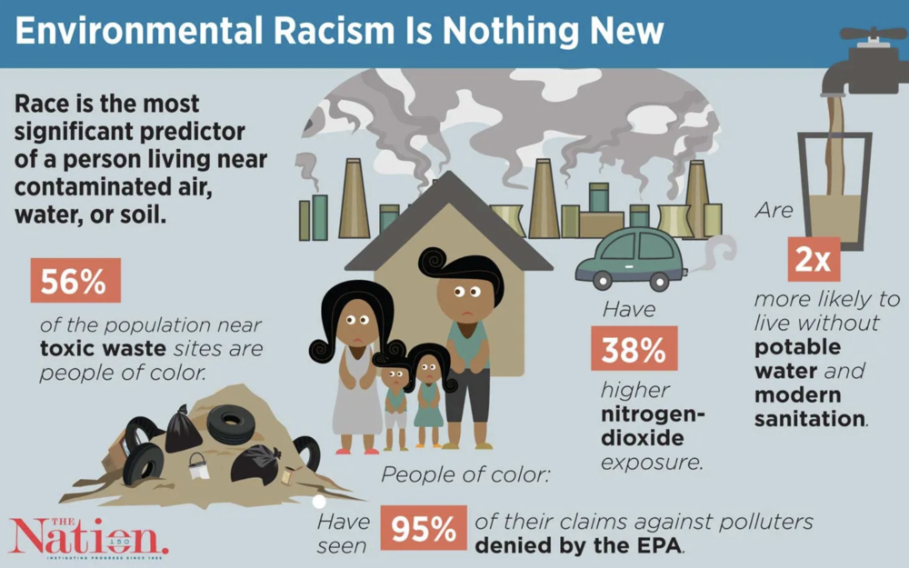 Welcome to Issue 6 of this newsletter! This week’s topic is Environmental Racism. Environmental racism is the disproportionate impact of environmental hazards on people of color. It refers to the institutional rules, regulations, policies or government and/or corporate decisions that deliberately target certain communities for locally undesirable land uses and lax enforcement of zoning and environmental laws, resulting in communities being disproportionately exposed to toxic and hazardous waste based upon race. We’re going to look at a few examples of environmental racism in the US and the factors that contribute to this inequality. Let’s get into it!